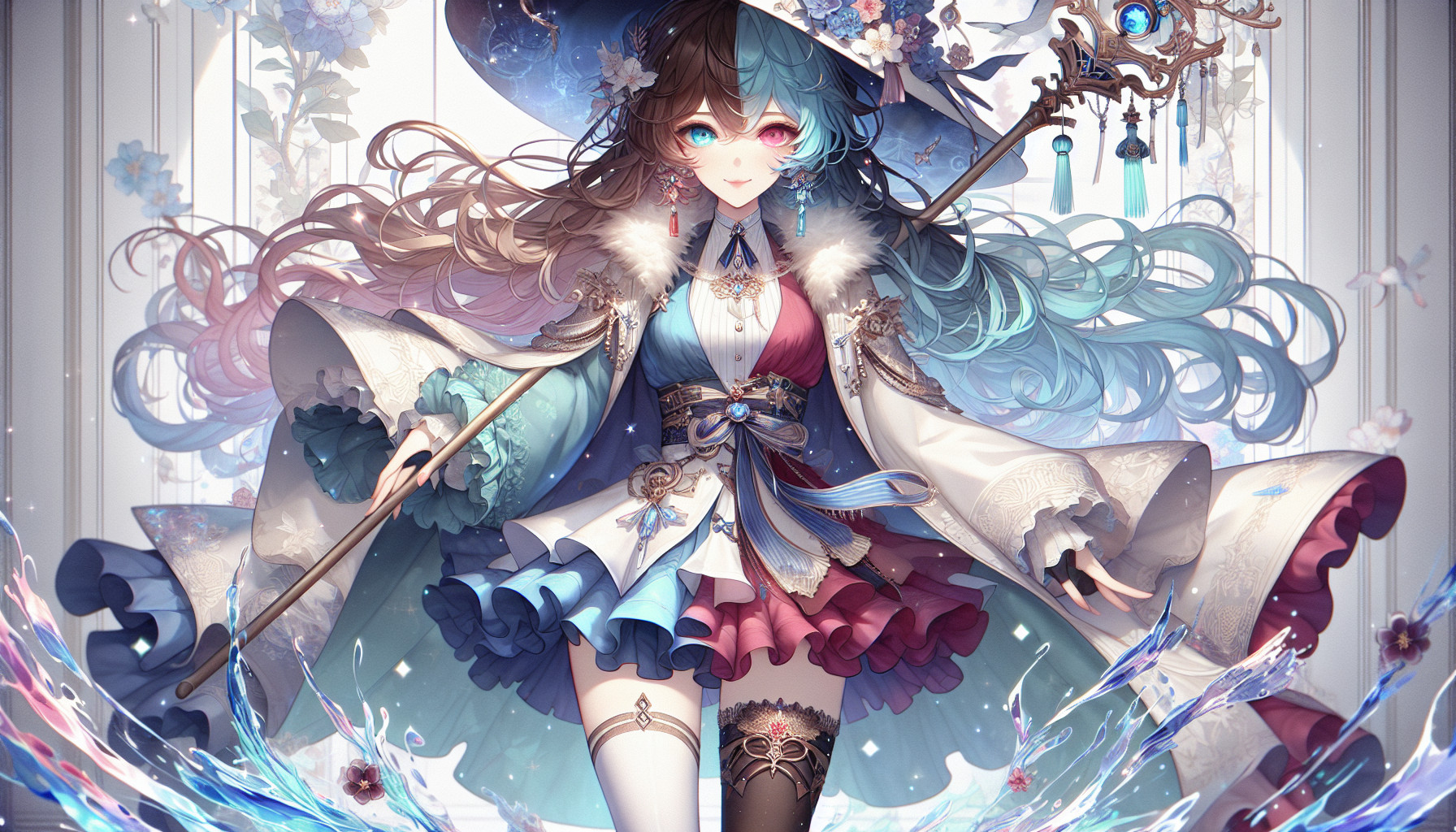 (masterpiece, best quality, highres, official art), Genshin Impact style, 1girl, Fusion character: Furina de Fontaine Hu Tao, elegant yet mischievous expression, heterochromia eyes (right eye: Furina's deep ocean blue, left eye: Hu Tao's vibrant plum blossom pink), long flowing wavy hair in gradient shades of Furina's pale teal and Hu Tao's dark brown, wearing an elaborate fusion outfit: Furina's elegant opera-inspired coat and ruffled elements combined with Hu Tao's signature short skirt, wide-brimmed hat adorned with Furina's hydro symbols and Hu Tao's plum blossoms, thigh-high stockings with asymmetrical Furina blue and Hu Tao dark red accents, holding a fusion staff: Hu Tao's polearm base with Furina's hydro aesthetic swirls, dynamic pose, soft glowing particles (hydro blue pyro sparks), intricate details, beautiful background of Fontaine architecture with Wangsheng Funeral Parlor elements subtly blended