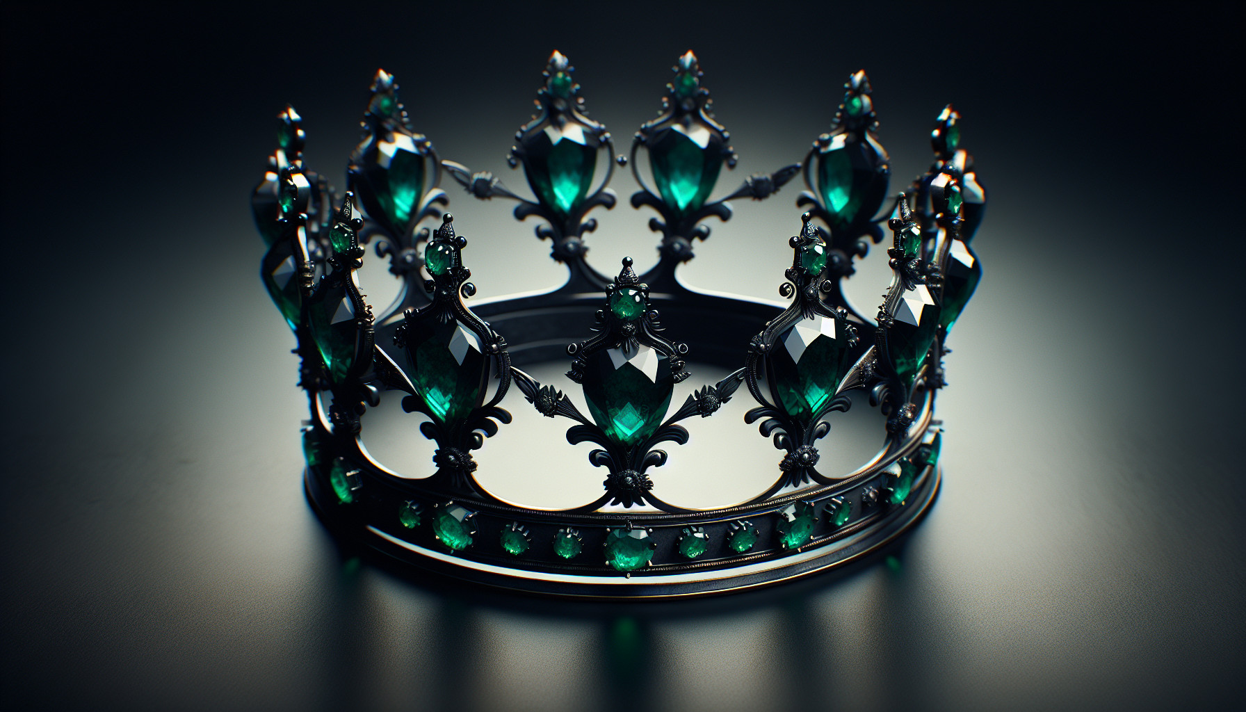 A black crown with gold thin trim and emerald gems thats made of black metal