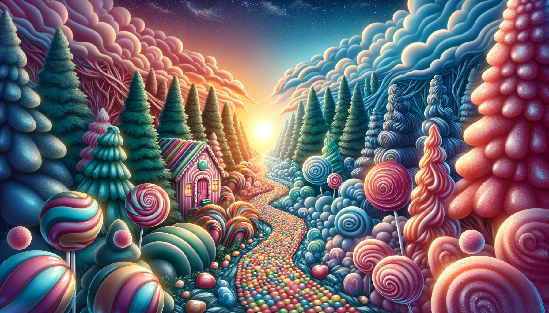 Candyland forest with a candy path to a candyland house with cotton candy clouds and sunset with a big pretty