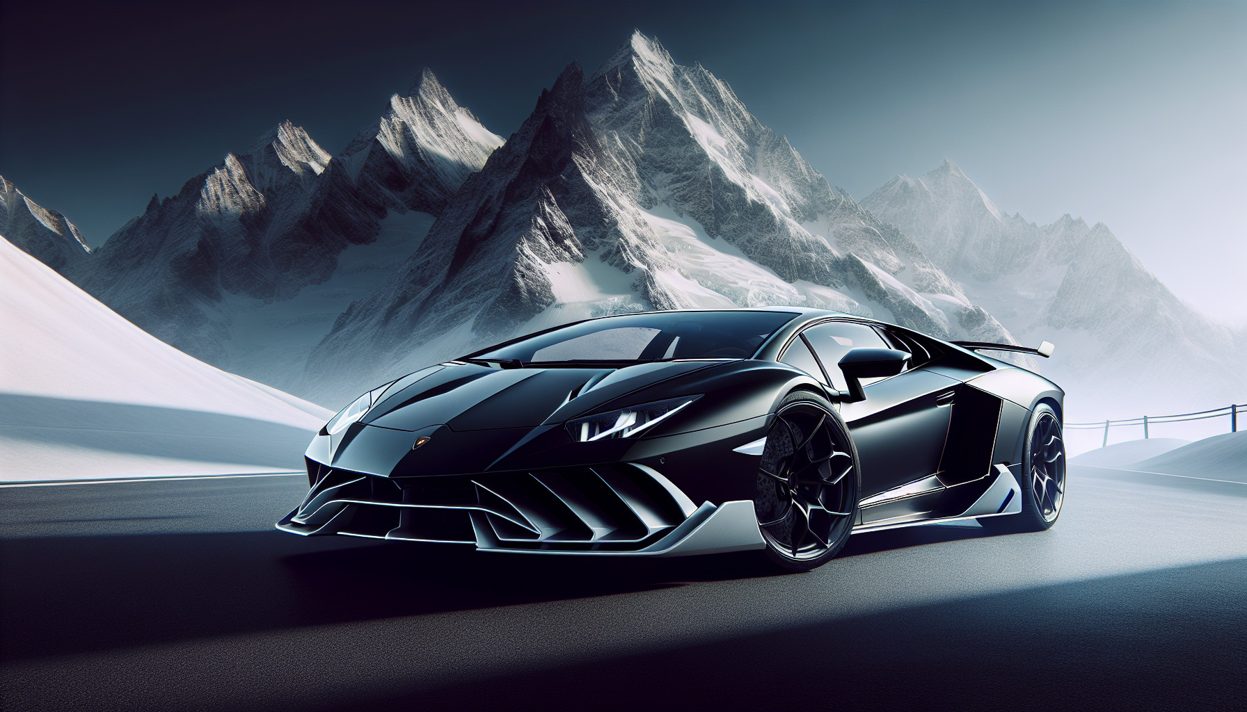 Black and silver lamborghini with a mountainous snowy background