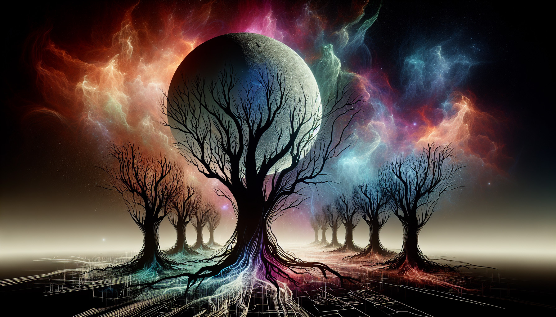 moon with strange color between dead trees and plans