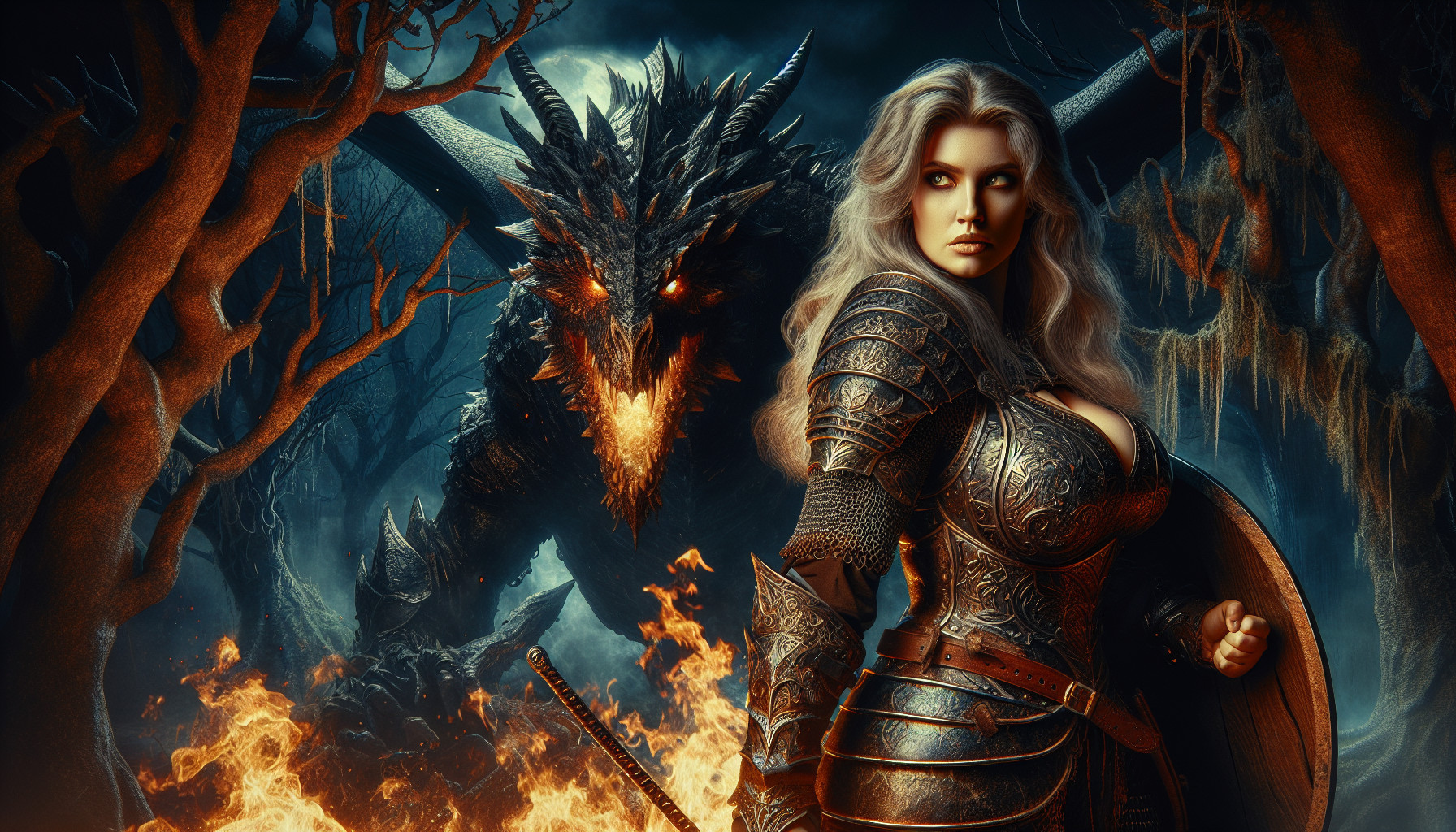 A fierce plus size female warrior surrounded by fire in a haunted forest with a big black dragon
