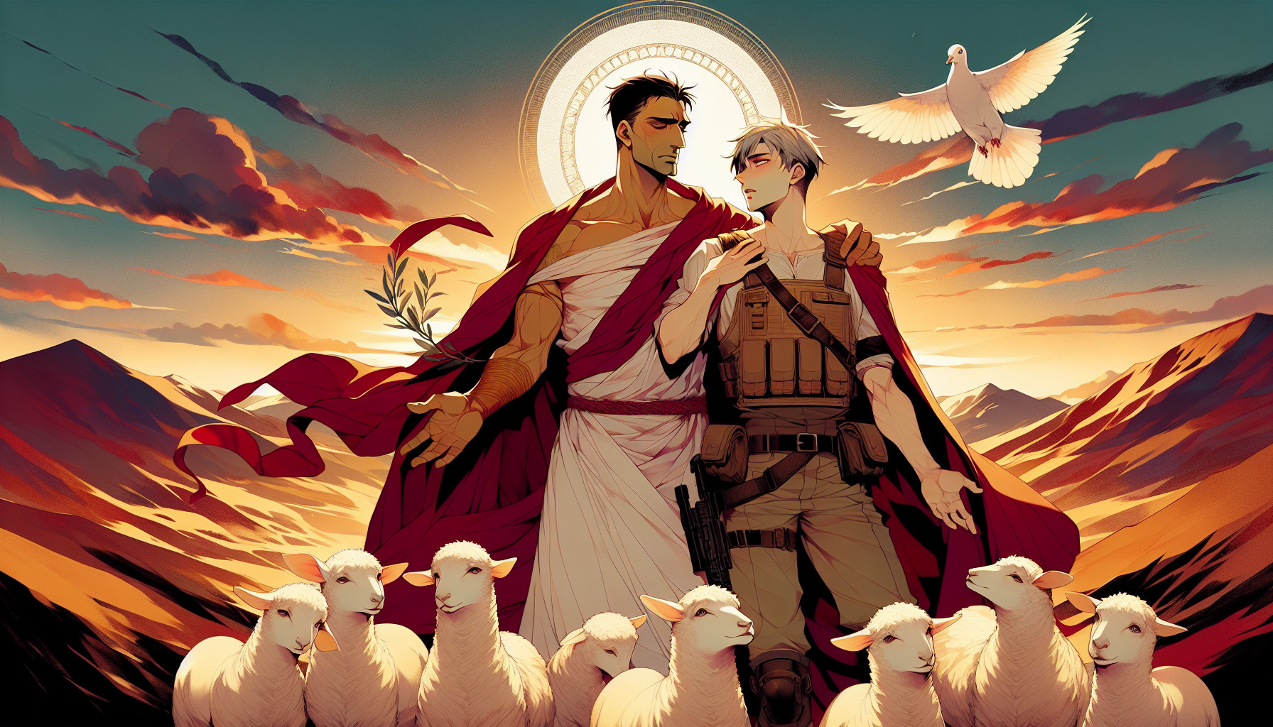 A man wearing white robes with a deep garnet red sash standing with his arms outstretched as if ready to embrace the viewer. A golden halo of light gently surrounds his head and a calm and loving expression upon his face, and a rich tan on his skin. Standing next to the man in is a much more muscular man who appears to be a soldier, equaly rich tan with his right arm raised toward the sky. The scene is a barren and rocky mountain top with a warm red and yellow and orange sunset behind the figures. There are eleven young white sheep close to the men and one gray sheep off to the side looking lost and alone. A single white dove flys above the scene grasping a small olive twig in its beak.