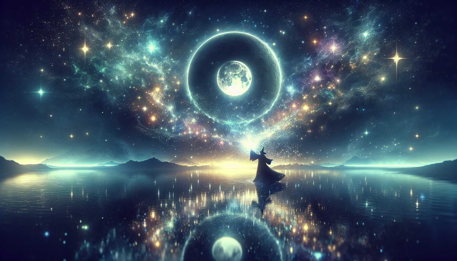 Inspired in Elden Rings visual style: Ranni's Full moon Sorcery fully casted in darkness with stars above it and calm waters beneath it.