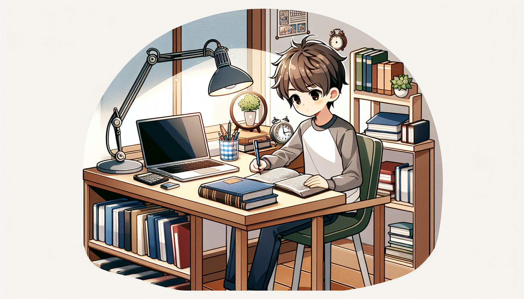 create a wallpaper study table where a boy study with his laptop and books and organised book by side and study lamp