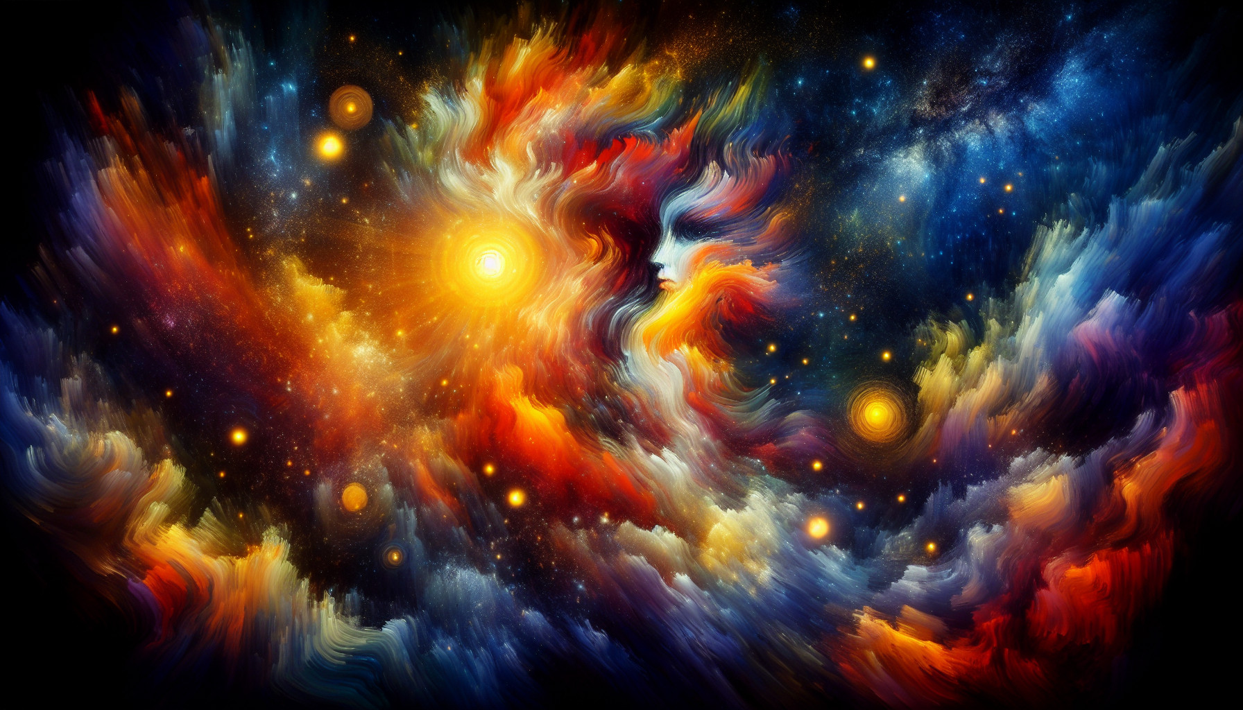 This is a beautiful and evocative piece of abstract art with a strong celestial or cosmic theme.The style is highly reminiscent of post-impressionism, particularly the work of Vincent van Gogh, due to its dynamic, swirling brushstrokes and vibrant, expressive use of color. The entire composition feels alive with movement and energy.A brilliant, warm palette of yellows, oranges, and reds forms a central, glowing figure, which contrasts sharply with the deep blues and purples of the surrounding space. This central shape is abstract, but one could interpret it as a celestial being, a nebula, or even a face-like form (an effect known as pareidolia).The background is a dark, starry expanse, populated with numerous glowing orbs that resemble stars or distant planets, enhancing the deep-space feel. The overall effect is dreamlike, mystical, and full of wonder.