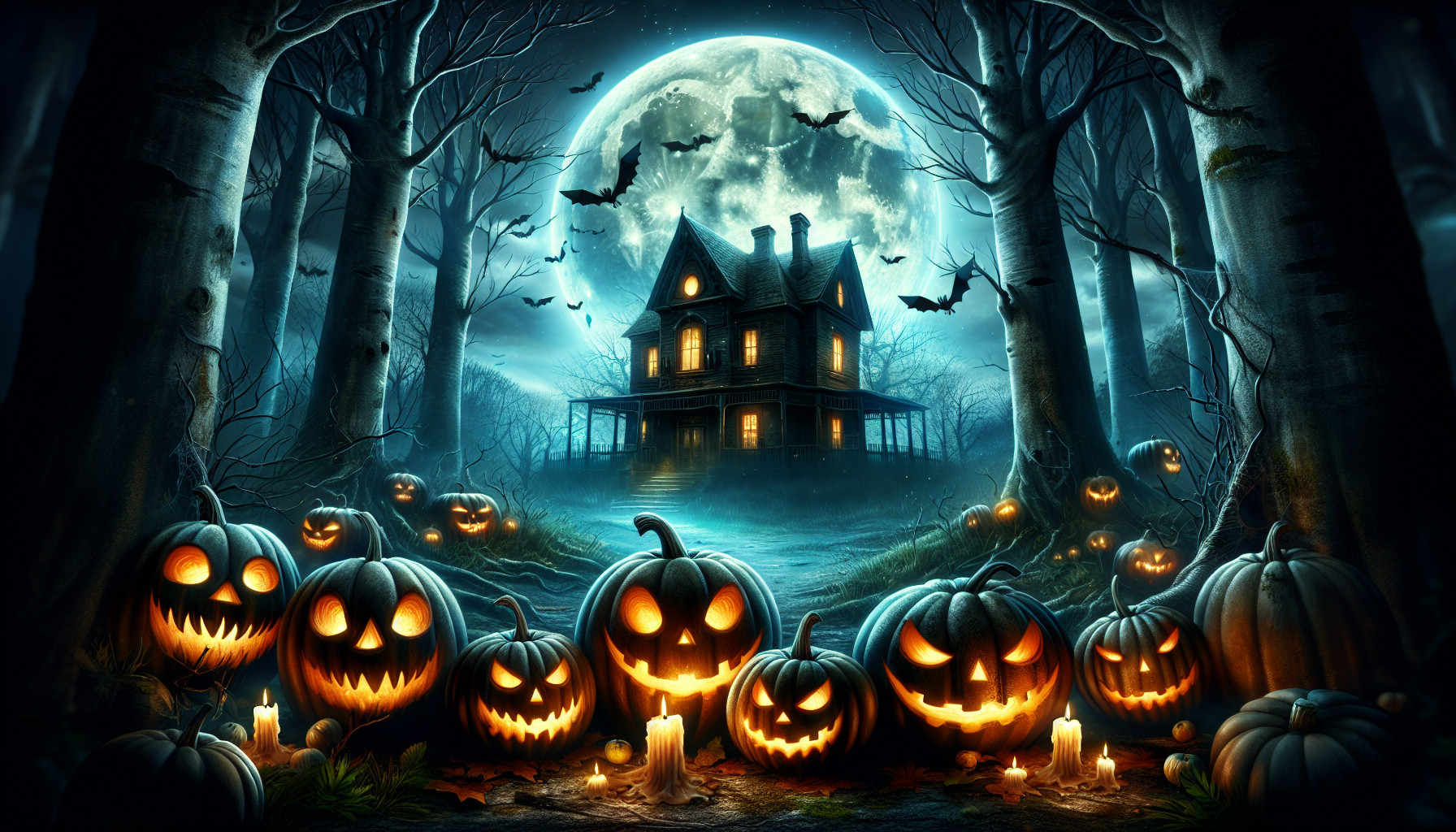jack-o-lanterns in front of a haunted houses in a spooky forrest. Bats flying under a full moon.