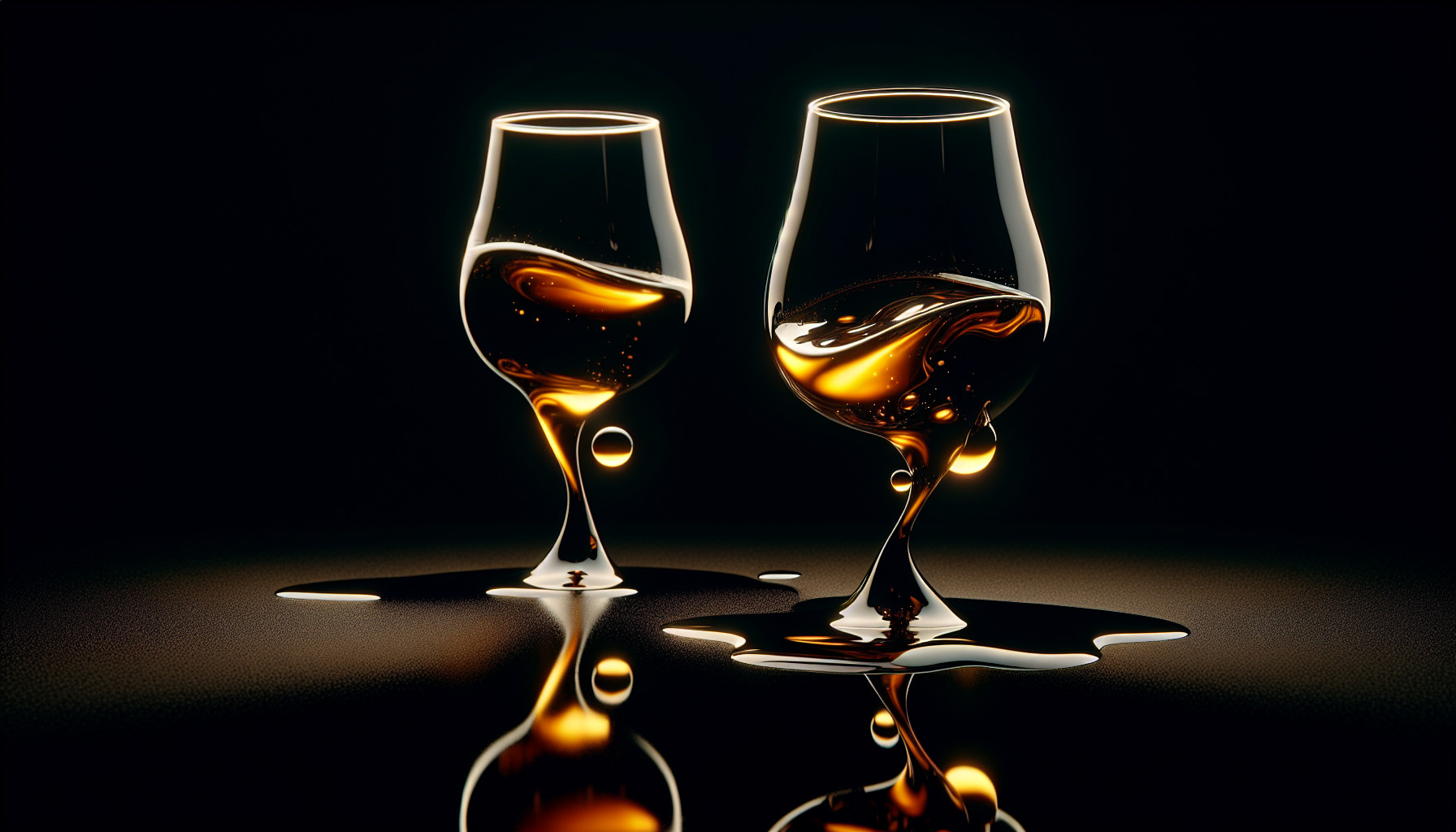 Draw an image shows two wine glasses filled with a glowing dark amber liquid that appears to dripped onto the black surface below but no liquid is seen on on the outside of the glasses or dripping down, creating a reflective puddle. The effect is surreal and artistic, with a strong contrast against the dark background.. Make the aspect ratio 16:9