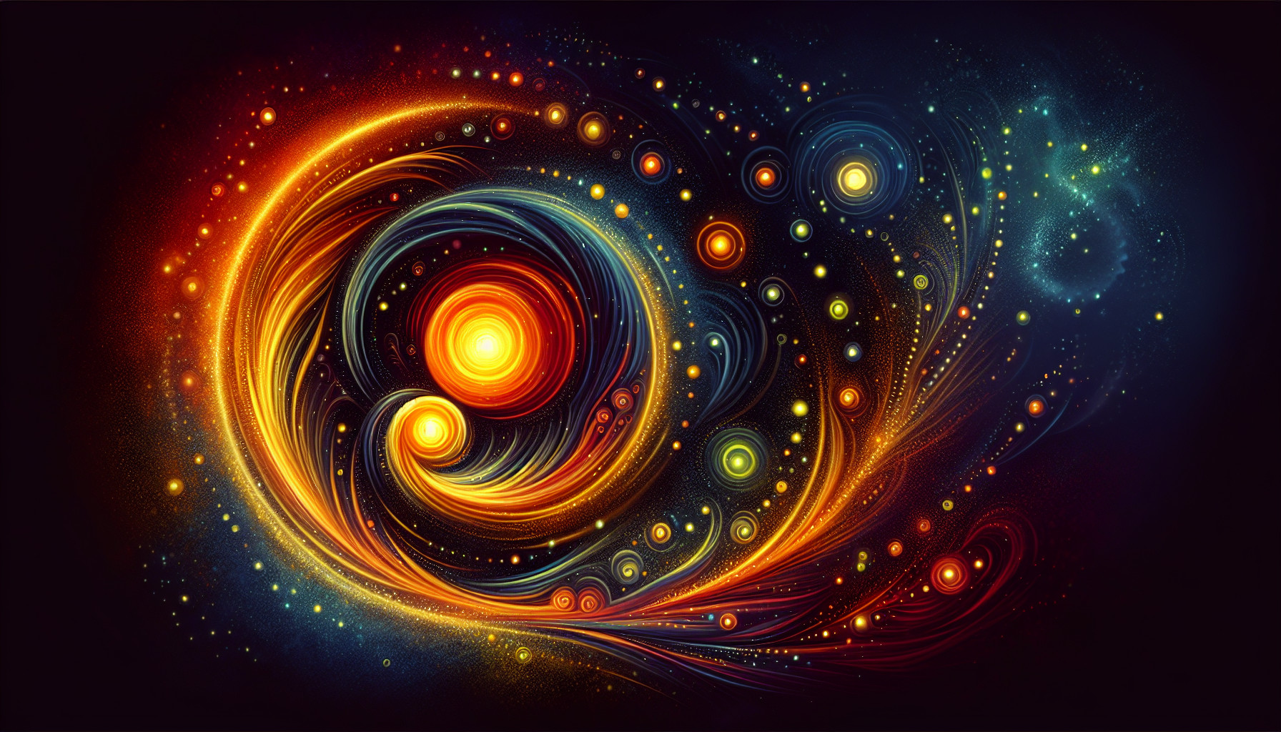 Draw an image is an abstract, vibrant artwork with a cosmic theme. It features a central composition of two swirling, oval-shaped forms that resemble celestial bodies with a warm color palette of yellows, oranges, and reds. These forms are intertwined, creating a sense of movement or orbit, and are set against a dark blue-black background dotted with small, glowing dots representing stars. The upper part of the image has a brighter, sun-like circle, adding a focal point that enhances the celestial feel. Scattered throughout are additional small, circular lights in green and yellow, contributing to the starry, ethereal atmosphere. The overall effect is a blend of organic and cosmic elements, suggesting a nebula or a stylized depiction of a mother and child in a universal context. Make the aspect ratio 16:9.
