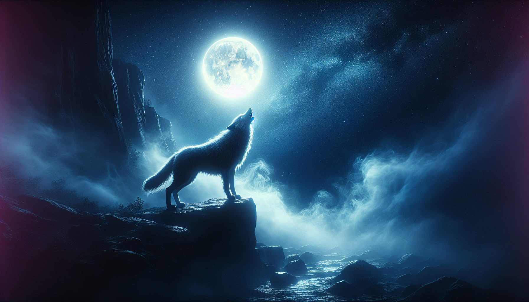 A majestic wolf howling at a full moon under a starry night sky, standing on a rocky cliff, surrounded by mist and glowing moonlight. The scene is dramatic and atmospheric, with detailed fur texture, realistic lighting, and deep blue tones. High resolution, cinematic style, crisp details, moody lighting, ultra-realistic.