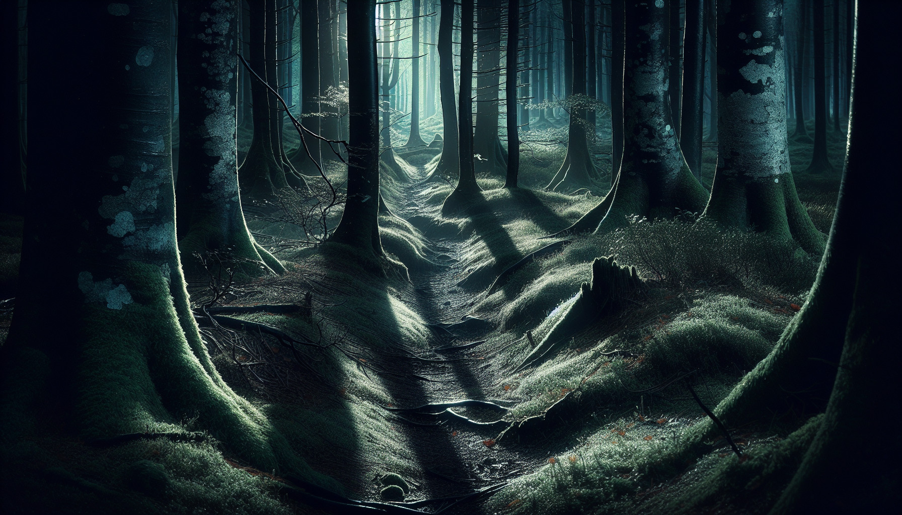 Die Luft ist kühl und feucht, erfüllt vom Geruch von Erde, Moos und nassem Laub. Der schmale Pfad schlängelt sich zwischen dunklen Baumstämmen hindurch, deren Kronen sich über dir wie ein Dach schließen. Nur spärlich dringt Mondlicht durch die Äste, legt silbrige Streifen auf den Boden und lässt das Unterholz in fahlem Glanz schimmern.Das Knacken eines Zweigs unter deinem Fuß hallt plötzlich laut in der Stille. Irgendwo raschelt es – vielleicht ein Igel, vielleicht der Wind. Die Schatten bewegen sich leicht, als würden sie atmen.Manchmal flackert das Licht eines Glühwürmchens auf, oder du siehst den blassen Nebel zwischen den Bäumen hängen. Der Wald wirkt lebendig, doch auf eine zurückhaltende, uralte Weise – als würde er dich beobachten, schweigend und ruhig.
