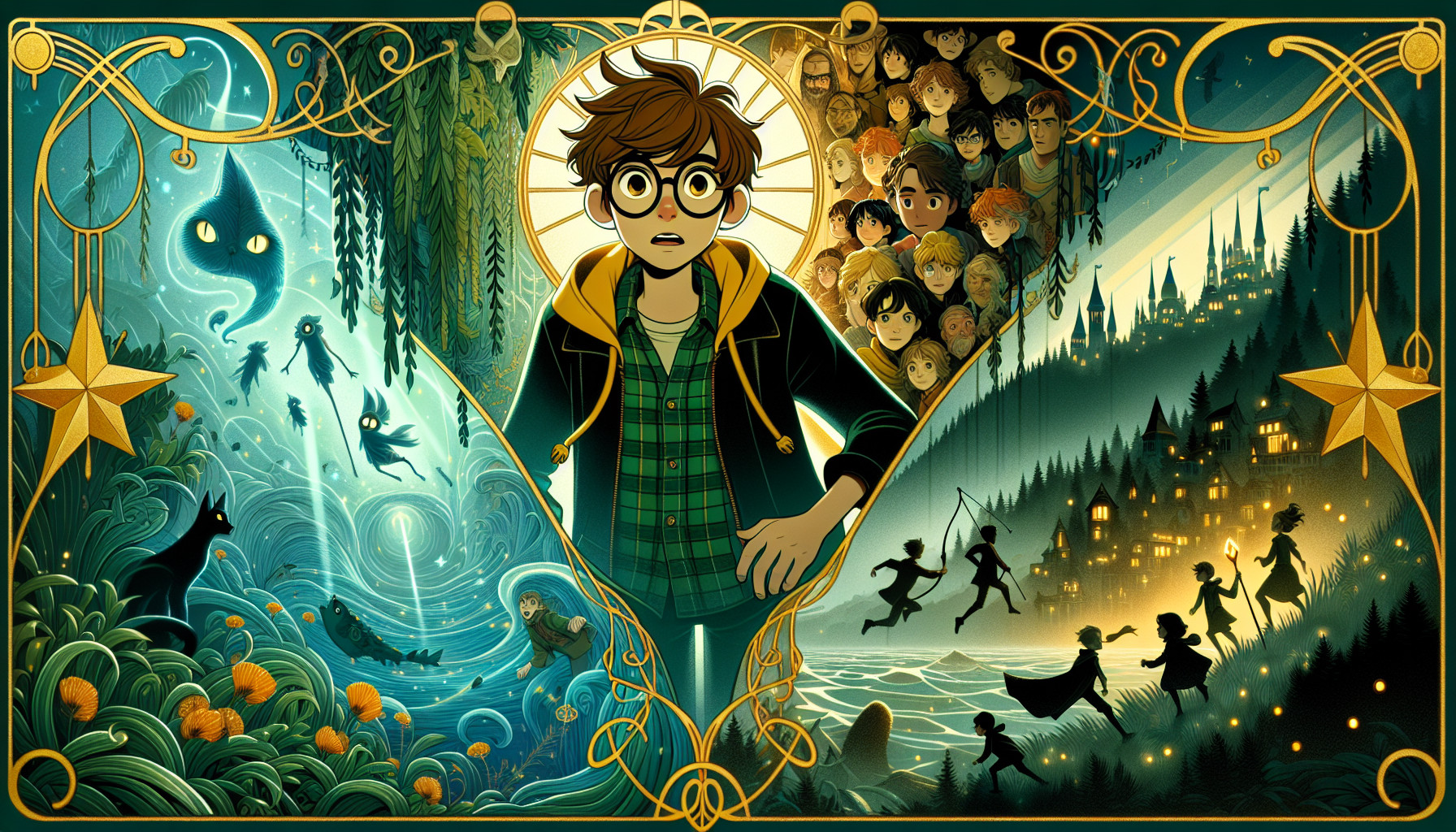cinematic animated-fantasy adventure poster, collage composition. Center focus: teen boy with round glasses, tousled brown hair, green plaid shirt and yellow-hooded jacket, expression of wonder. Surrounded by swirling art-nouveau filigree in teal and gold. Left side: misty rainforest with hanging vines, a group of kids and a bearded mentor archer, tiny fairies and quirky creatures, volumetric god rays. Right side: moonlit hilltop city with spires and a warm lantern-lit market, a spectral blue feline-dragon head roaring. Bottom: splashing ocean scene with the boy running across water, a shadowy wolf, bioluminescent sprites and flying fish. Dynamic motion, sparkling particles, rich textures, rim lighting, depth of field, vibrant teal–cyan–gold palette, studio-quality, 8k digital painting, no text, no watermark.