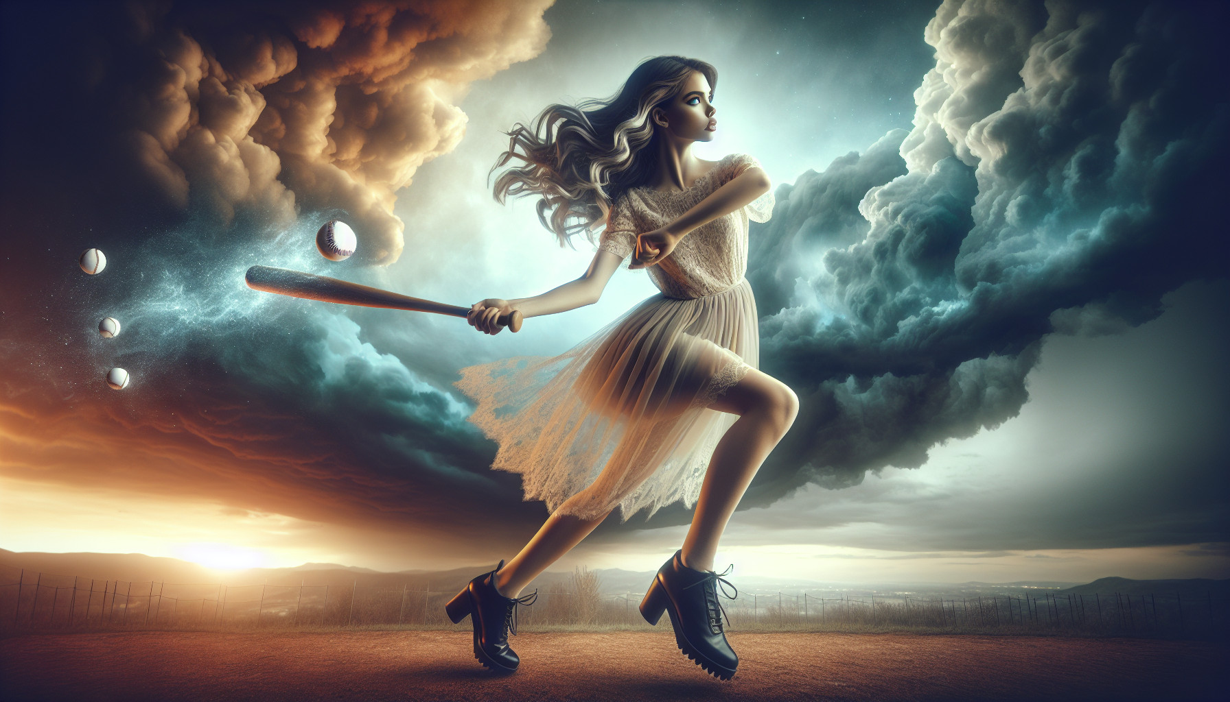 beautiful girl swinging baseball bat clouds dark above
