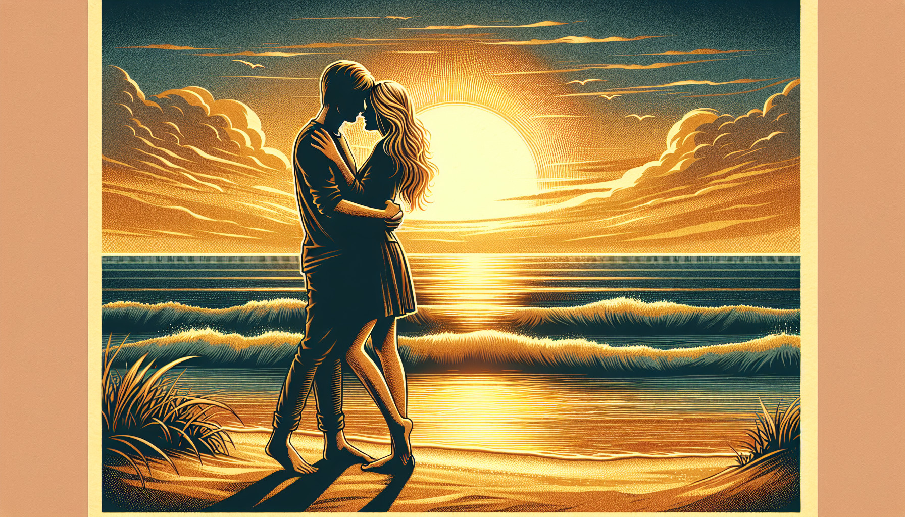 Blonde girl hugging taller brunette boyIn a beautiful sunset on the beach