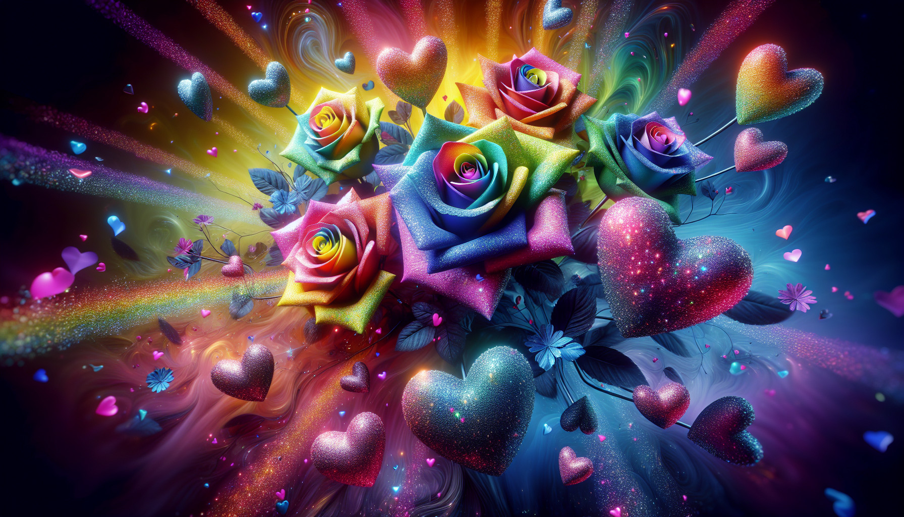 rainbow roses with glitter on the rose petals, glitter heart background, 3D